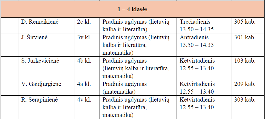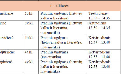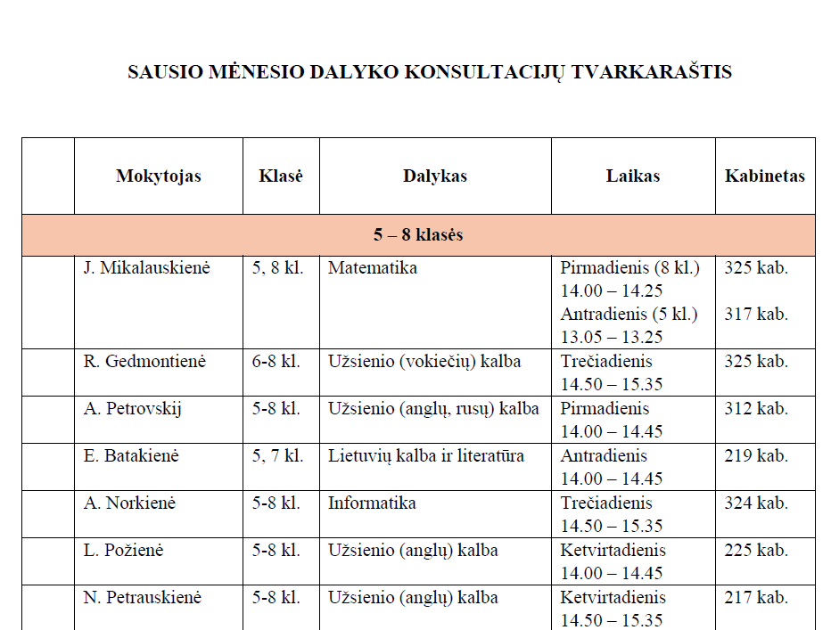 2026 m. sausio mėnesio dalyko konsultacijų tvarkaraštis 1 - 8 kl. mokiniams
